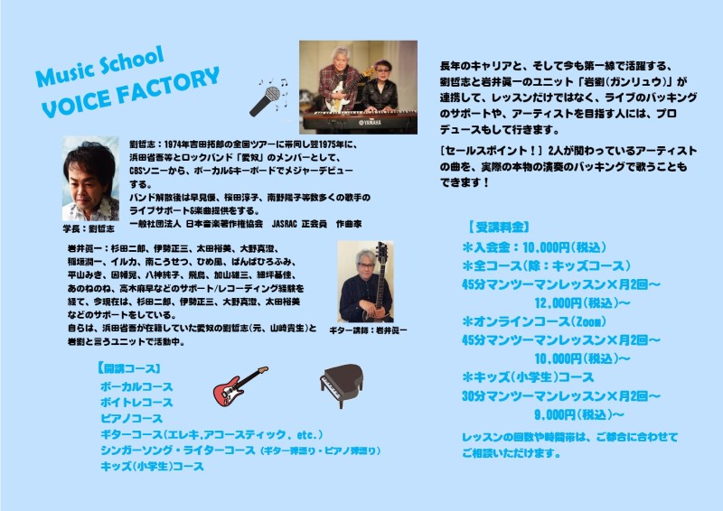 | 2020.3.17 | ボイスファクトリーの校長「劉哲志」によるnoteもスタートしました♪ ボイストレーニングについて日々思うことを発信していきます。 ●劉哲志のボイトレについて思うこと。 |