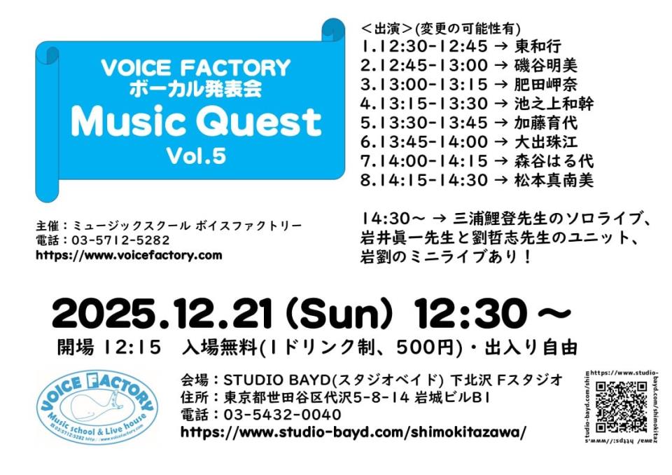 | 2025.11.05 | 2025年12月21日 12:30~ 生徒の発表ライブを開催します。 入場無料(ドリンク制、500円) 会場:スタジオベイド下北沢 Fスタジオ https://www.studio-bayd.com/shimokitazawa/ 14:30~三浦先生のソロライブと、岩井眞一先生と劉哲志先生のユニット、岩劉のミニライブあり! | |