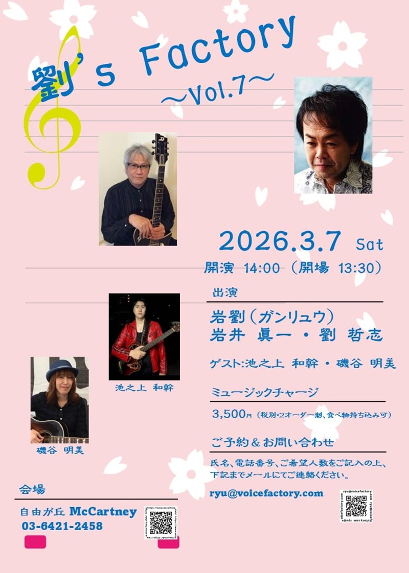 | 2025.02.05 | 来る3/16(日)に、自由が丘マッカートニーにて、当校の学長の劉哲志と、ギター講師の岩井眞一のユニット、岩劉(ガンリュウ)のライブが開催されます。 オープニングアクトには、生徒の加藤育代さんとminaseさんが出演します! 大人のサウンド、唯一無二のガンリュウの世界を是非お楽しみください♪ 沢山のご来場、心よりお待ちしてます♪ | |